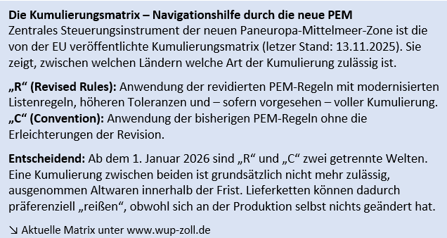 Ab dem 1. Januar 2026 gilt: Länder, die bereits einen „dynamischen Link“ zum revidierten Übereinkommen („R“ in der Kumulierungsmatrix) gesetzt haben, wenden nur noch die neuen PEM-Regeln an. Länder ohne diesen Link verbleiben im alten Ursprungssystem („C“). Eine Durchlässigkeit zwischen alten und neuen Regeln besteht nicht mehr. Damit entstehen faktisch zwei getrennte Präferenzzonen, zwischen denen keine diagonale Kumulierung möglich ist.